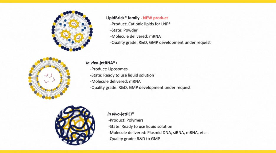 Enabling RNA/DNA therapeutics development from Discovery to Human clinical trials. Our portfolio includes a wide range of products, from the gold standard cationic polymer-based in vivojetPEI®, which is ready-to-use and ensures the delivery of any type of nuclec acids, to ready-to-use lipid-based nanoparticles: in vivo-jetRNA®+, dedicated to the delivery of mRNA both in vivo and ex vivo, and cationic lipids used as bricks to formulate and improve lipid nanoparticles (LNPs) formulation to open up new possibilities for mRNA-based therapies.