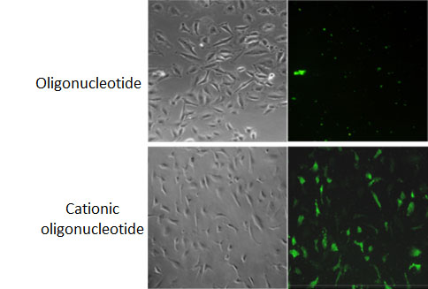 OLIGOPLUS is a novel class of cationic modified oligonucleotides developed by Polyplus-transfection, and that require no delivery agent as they act as cell-delivering oligonucleotides. This is achieved by grafting cationic spermine units onto the oligonucleotide to create a positively charged oligospermine-oligonucleotide conjugate. These new cationic oligonucleotides are produced using the standard phosphoramidite chemistry via automated solid phase synthesis and a spermine phosphoramidite derivative (Voirin et al., 2007). These positively charged oligonucleotides are highly stable molecular conjugates and have a size of a few nanometers, which is close to the size of an oligonucleotide. Such cationic oligonucleotides are thus able to diffuse and to bind the cell membrane, inducing an endocytosis and transport in the cytoplasm (Nothisen et al., 2009).