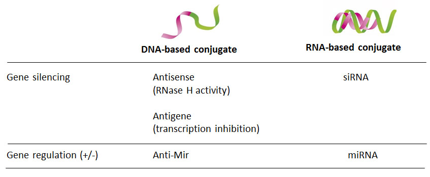 This technology can apply to different classes of therapeutic oligonucleotides such as siRNA, antisense and anti-miR. In the case of siRNA, a sub-class called SIRNAPLUS® have been developed and fully characterized. SIRNAPLUS® conjugates are stable, active in the presence of serum and have shown specific gene silencing activity at low nanomolar concentration. Their in vivo gene silencing efficacy is currently under evaluation, in xenograft tumor and lung metastasis models, and in neuronal progenitor cells in mouse brain.
