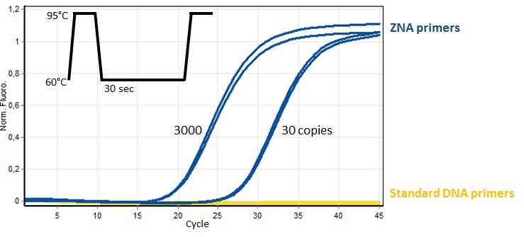 ZNA® primers can be used for PCR, quantitative PCR and RT-PCR (Reverse Transcription PCR), fast PCR, multiplex assays, A-T rich region amplification, or high-throughput PCR. ZNA® primers were found to drive PCR or RT-PCR reactions very efficiently with the following properties: